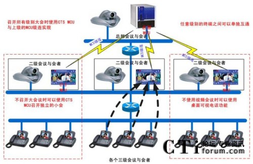 此方案由于使用了簡(jiǎn)單而廉價(jià)的CTS軟件MCU,讓3級(jí)會(huì)議與會(huì)者接入CTS MCU,然后由CTS MCU再與上級(jí)總的MCU做級(jí)連,從而省去了在原來(lái)總部MCU端增加與會(huì)者數(shù)量許可的價(jià)格。