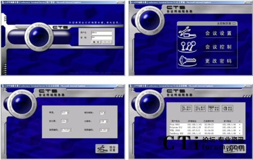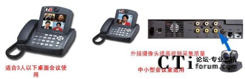 方案中采用的終端為CTS的可視電話終端,該可視電話適合于1-3人的桌面會(huì)議,自帶5寸的屏幕,不用額外連接電視機(jī),特別適合于縣級(jí)鄉(xiāng)級(jí)等底等級(jí)的機(jī)構(gòu)使用。同時(shí)可視電話可以外接入清晰的攝像頭,滿足5-10人小會(huì)場(chǎng)對(duì)于視頻的清晰度要求。