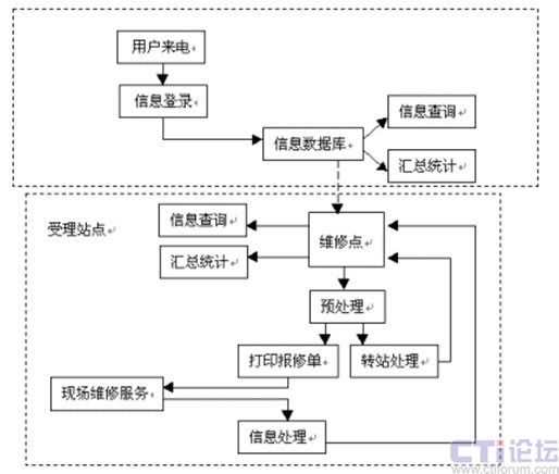 維修點對用戶的報修情況進行預(yù)處理之后,根據(jù)用戶所在的區(qū)域,分配至最近距離的維修站,將用戶與其報修信息即時轉(zhuǎn)移,這也就是圖中所顯示的"轉(zhuǎn)站處理"。之后,維修站將直接打印出報修單,加快服務(wù)實施的效率、減少人工出錯的比例,有專業(yè)人員及時上門服務(wù)檢修。