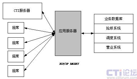 Ο數(shù)據(jù)接口采用三層C/S結(jié)構(gòu),通過構(gòu)建功能強(qiáng)大的應(yīng)用服務(wù)器,把呼叫中心的數(shù)據(jù)流與燃?xì)夤究蛻粝到y(tǒng)、營(yíng)業(yè)系統(tǒng)、搶修系統(tǒng)和燃?xì)庹{(diào)度系統(tǒng)結(jié)合起來,充分利用了已有系統(tǒng)標(biāo)準(zhǔn)的數(shù)據(jù)接口,實(shí)現(xiàn)對(duì)后臺(tái)數(shù)據(jù)庫的訪問。如圖:
