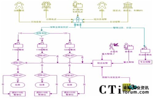 公安指揮綜合管理系統(tǒng)針對公安接處警的工作流程為:報警接收、報警識別、指揮調(diào)度、派警發(fā)送、處警記錄、全過程語音文本信息監(jiān)督、統(tǒng)計分析。指揮調(diào)度中又包括預(yù)案編制調(diào)用、有無線通信調(diào)度、實時監(jiān)控信息接收。系統(tǒng)工作流程如下圖所示: