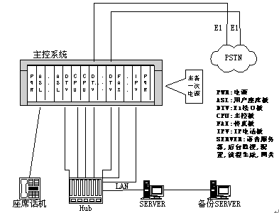 1、 基于數(shù)字程控交換技術(shù),主控系統(tǒng)通過LAN與SERVER交互語(yǔ)音與傳真數(shù)據(jù);