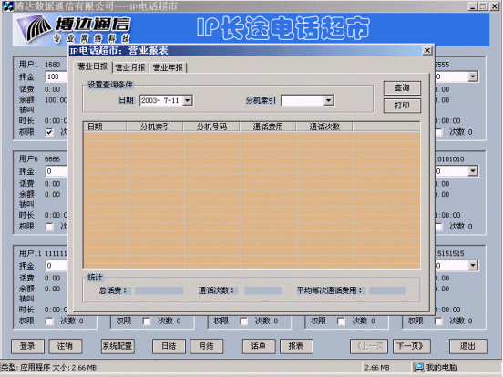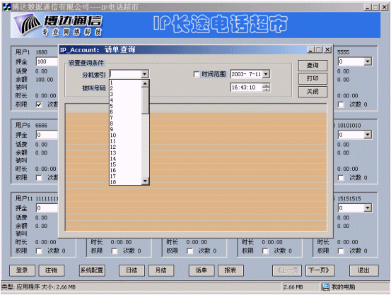 博達(dá)公司在IP電話認(rèn)證的基礎(chǔ)上開發(fā)的IP電話計費(fèi)計費(fèi)系統(tǒng),實現(xiàn)了用戶管理、卡用戶批量生成、費(fèi)率設(shè)置、折扣設(shè)置、話單查詢、帳務(wù)查詢、管理統(tǒng)計、運(yùn)營分析等功能,為電信運(yùn)營商的運(yùn)營和企業(yè)用戶對IP電話的內(nèi)部管理和服務(wù)提供了有利條件。