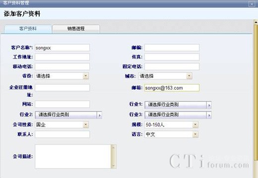 對新添加的客戶錄入客戶信息資料,包括客戶的名稱、郵箱等,為其建立起一個(gè)新的客戶關(guān)系,可以隨時(shí)找到該客戶的具體信息以及他的銷售情況,方便對客戶銷售進(jìn)程有一個(gè)充分地實(shí)時(shí)跟蹤,并為之更好地服務(wù)。