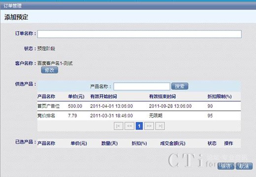 選擇訂單的名稱,供客戶選擇的產(chǎn)品,在供選產(chǎn)品列表下選擇產(chǎn)品名稱,然后所選的產(chǎn)品就會(huì)出現(xiàn)在已選產(chǎn)品列表下,完成后點(diǎn)擊【保存】,這樣一個(gè)訂單就生成了。
