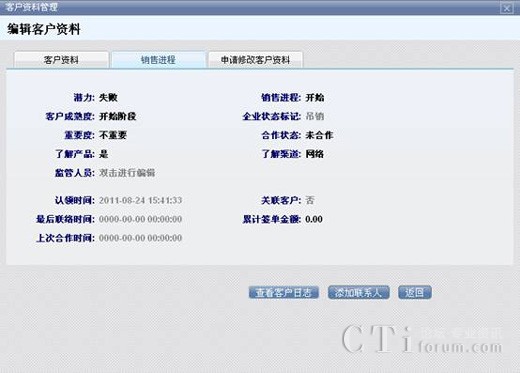 點(diǎn)擊標(biāo)簽選擇要查看的客戶資料,和銷售進(jìn)程。查看客戶日志能看到該客戶被執(zhí)行操作的歷史情況,例如資料的變更,所屬的變更等等。添加聯(lián)系人是指為當(dāng)前客戶添加新的聯(lián)系人,添加完聯(lián)系人信息后,聯(lián)系人就會(huì)被納入到該客戶資料里。