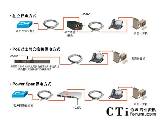 IP電話相對于原有模擬分機或數(shù)字分機采用以太網(wǎng)端口連接,其供電方式也相應(yīng)隨之改變,46xx系列IP硬件話機支持以下3種供電方式: