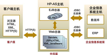 在一個(gè)開發(fā)環(huán)境中把上述3層一般都安裝在同一臺(tái)計(jì)算機(jī)上,以便模擬3層環(huán)境。這樣,開發(fā)者在實(shí)際環(huán)境開發(fā)應(yīng)用之前,可以快速開發(fā)和測(cè)試應(yīng)用?墒,在實(shí)際環(huán)境中,各個(gè)層一般位于不同的計(jì)算機(jī)上。圖2表示了HP-AS是如何采用J2EE技術(shù)實(shí)現(xiàn)分布式應(yīng)用的。