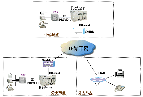 對(duì)于大多數(shù)的企業(yè)用戶,都擁有自己的用戶交換機(jī)PBX。在進(jìn)行IP電話網(wǎng)的建設(shè)中,這些PBX將被保留,繼續(xù)承擔(dān)起用戶接入的功能。而這些PBX之間的中繼連接都將通過IP骨干網(wǎng)來完成。這樣,既可以節(jié)約價(jià)格不菲的長(zhǎng)途中繼租用費(fèi),也避免了大規(guī)模的改造所帶來的浪費(fèi)。