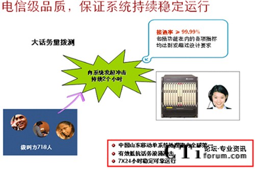 華為聯(lián)絡(luò)中心系統(tǒng)具有高穩(wěn)定性、高可靠性、易擴(kuò)展性和可維護(hù)性。這主要源于華為對(duì)電信網(wǎng)絡(luò)現(xiàn)狀與演進(jìn)的理解,源于華為擁有固定、移動(dòng)和IP三個(gè)網(wǎng)絡(luò)方面綜合實(shí)力。華為數(shù)以千計(jì)的核心平臺(tái)開發(fā)測(cè)試人員,幾十種極端環(huán)境(如超大話務(wù)量、溫差、濕度、鹽堿度、缺氧等),磨礪出的是世界級(jí)的高品質(zhì)。麥加朝圣10KM內(nèi)密集200萬(wàn)移動(dòng)用戶,大部分為國(guó)際漫游,整齊劃一的用戶行為,形成連日多波話務(wù)尖峰,網(wǎng)絡(luò)受不均衡沖擊,系統(tǒng)容易雪崩。使用華為方案STC連續(xù)四年征服HAJJ期間話務(wù)高峰,告別系統(tǒng)每逢朝圣就癱瘓歷史。正是繼承了這樣的DNA,我們?cè)谀骋苿?dòng)運(yùn)營(yíng)商聯(lián)絡(luò)中心系統(tǒng)單點(diǎn)實(shí)測(cè)BHCC1200K,每天平均呼叫量為600萬(wàn)次,一套系統(tǒng)支撐著2000多座席和近8000路IVR。