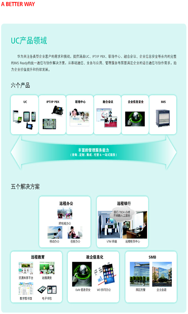 華為企業(yè)業(yè)務(wù)是華為三大業(yè)務(wù)集團(tuán)之一。依托華為強(qiáng)大的研發(fā)和綜合技術(shù)能力,我們?cè)谄髽I(yè)業(yè)務(wù)領(lǐng)域與合作伙伴開放合作,理解客戶所需,致力于為全球政府及公共事業(yè)、金融、交通、電力、能源、商業(yè)企業(yè)及互聯(lián)網(wǎng)等行業(yè)以及大中小企業(yè)客戶提供全面、高效的ICT解決方案和服務(wù),包括IP基礎(chǔ)網(wǎng)絡(luò)、統(tǒng)一通信與協(xié)作、云計(jì)算與數(shù)據(jù)中心等。