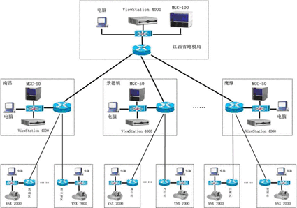 系統(tǒng)的具體設(shè)備配置為:在省局配備MGC--100一臺,省局會議室使用POLYCOM公司VSX7000會議終端一臺及VS4000會議終端兩臺;在南昌、景德鎮(zhèn)、九江等11個(gè)市局全部配備MGC-50各一臺以及POLYCOM公司VS4000會議終端各一臺,VSX7000會議終端各若干臺(共131臺),從而實(shí)現(xiàn)整個(gè)視頻會議網(wǎng)絡(luò)的多點(diǎn)視頻會議功能。
