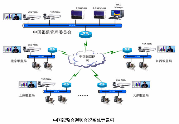 中國銀監(jiān)會目前已經(jīng)擁有一個高速、高可靠性的ATM骨干傳輸網(wǎng)絡(luò),網(wǎng)絡(luò)采用星形結(jié)構(gòu),各分支機(jī)構(gòu)到北京總部的線路均為2條15M ATM線路,這種優(yōu)良的網(wǎng)絡(luò)非常適合視頻會議業(yè)務(wù)的運營。視頻會議網(wǎng)建立完成后可以實現(xiàn)通過遠(yuǎn)程視頻會議,遠(yuǎn)程處理重點銀行業(yè)金融機(jī)構(gòu)監(jiān)事會的日常管理工作;遠(yuǎn)程審查銀行業(yè)金融機(jī)構(gòu)高級管理人員任職資格;遠(yuǎn)程討論協(xié)商制定有關(guān)銀行業(yè)金融機(jī)構(gòu)監(jiān)管的規(guī)章制度和辦法;遠(yuǎn)程對銀行業(yè)金融機(jī)構(gòu)實監(jiān)管,依法對違法違規(guī)行為進(jìn)行查處;更加可以通過遠(yuǎn)程雙流會議,按照國家有關(guān)規(guī)定,遠(yuǎn)程公布全國銀行數(shù)據(jù)、報表。