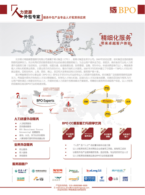 北京易才博普奧管理顧問有限公司(CTG BPO)是易才集團(tuán)全資子公司。2007年啟動(dòng)運(yùn)營,依托集團(tuán)全國的服務(wù)網(wǎng)絡(luò)和品牌實(shí)力,充分利用優(yōu)質(zhì)的服務(wù)理念及專業(yè)的信息處理服務(wù)能力,為企業(yè)客戶提供全方位、多層次、高標(biāo)準(zhǔn)的行業(yè)性人力資源外包服務(wù)方案(包括物流、公共服務(wù)、地面交通、信息數(shù)據(jù)處理、財(cái)務(wù)管理、金融、呼叫中心、快速消費(fèi)品等行業(yè))。