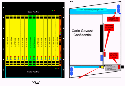 我們可以看到當(dāng)今市面上已有相關(guān)的零件商或系統(tǒng)商開發(fā)出14U或13U,12U的ATCA機箱。就ATCA機箱的型式來說可以分為直立型插卡與橫向型插卡兩種類型。直立式插卡機箱的標(biāo)準(zhǔn)為14槽(參考圖一B),而橫向型機箱因受限于機箱高度,所以視其高度決定槽數(shù)的多少。 ATCA的架構(gòu)主要包括以下部分:正面插槽,RTM,PEM,背板,CMMs,散熱系統(tǒng)。(參考圖一與圖二)