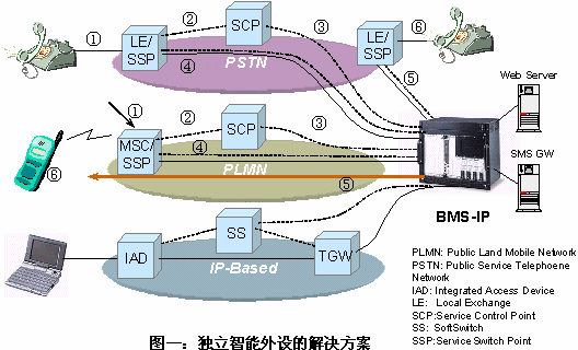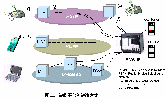 隨著通信發(fā)展,用戶對(duì)業(yè)務(wù)的多樣性、個(gè)性化和智能化的需求愈發(fā)緊迫。因此一種新業(yè)務(wù)在投入市場(chǎng)的時(shí)間,業(yè)務(wù)量和對(duì)現(xiàn)網(wǎng)設(shè)備改造等方面都提出了新的挑戰(zhàn)。智能業(yè)務(wù)平臺(tái)以分布接入、集中控制、業(yè)務(wù)擴(kuò)展靈活,可快速實(shí)現(xiàn)各類(lèi)電信增值新業(yè)務(wù)的突出優(yōu)點(diǎn),滿足了人們對(duì)電信新業(yè)務(wù)的迫切需要。智能業(yè)務(wù)平臺(tái)投資小、見(jiàn)效快,是近年來(lái)實(shí)現(xiàn)增值業(yè)務(wù)的優(yōu)選方案。在固定和移動(dòng)、電信和IT融合的發(fā)展潮流中,它具有很大的想象空間。用智能業(yè)務(wù)平臺(tái)實(shí)現(xiàn)BMS的工作原理如圖二所示。