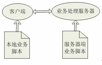 整個(gè)業(yè)務(wù)數(shù)據(jù)和業(yè)務(wù)處理都由XML配置管理,系統(tǒng)業(yè)務(wù)被分成本地業(yè)務(wù)邏輯和服務(wù)器端業(yè)務(wù)邏輯,客戶(hù)端通過(guò)提取本地業(yè)務(wù)邏輯腳本中的數(shù)據(jù)處理業(yè)務(wù)邏輯,業(yè)務(wù)處理服務(wù)器通過(guò)提取服務(wù)器端業(yè)務(wù)邏輯腳本中的數(shù)據(jù)訪問(wèn)數(shù)據(jù)庫(kù),并將數(shù)據(jù)庫(kù)返回結(jié)果發(fā)往客戶(hù)端。本地業(yè)務(wù)邏輯和服務(wù)器端業(yè)務(wù)邏輯之間的邏輯關(guān)系是通過(guò)一套配置腳本維護(hù)。如圖: