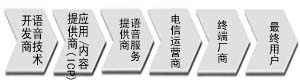 語音互聯(lián)網(wǎng)將最終形成由語音技術(shù)開發(fā)商-應用/內(nèi)容提供商-語音服務提供商-電信運營商-終端廠商組成的產(chǎn)業(yè)價值鏈(見圖2)。