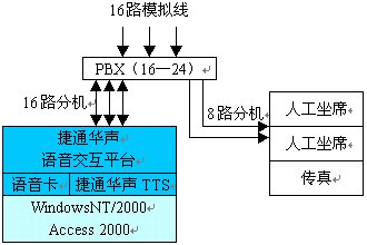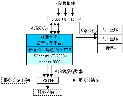 適用于中小型企事業(yè)單位的客戶服務(wù)系統(tǒng),或信息查詢系統(tǒng)。特點(diǎn)是線路資源主要用于交互系統(tǒng),可以最大限度的利用線路資源進(jìn)行服務(wù)或查詢工作。同時充分利用交換機(jī)進(jìn)行內(nèi)部線路交換,提高服務(wù)效率。