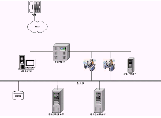 IVR模式是最常見(jiàn)的一種模式,這種模式也可以結(jié)合應(yīng)用到前端以交換機(jī)接入的系統(tǒng)中去,在系統(tǒng)的IVR服務(wù)流程上,做出相應(yīng)的修改,加入語(yǔ)音識(shí)別技術(shù),同樣可以得到成功應(yīng)用。另外一種模式暫且稱(chēng)它為后備模式,該模式一個(gè)主要的特點(diǎn)是放在后端,比如在有座席接聽(tīng)的情況下,采用語(yǔ)音識(shí)別技術(shù)的系統(tǒng)不被激活,也就是系統(tǒng)不給派線(xiàn)。當(dāng)系統(tǒng)繁忙,而座席都占用的情況下,系統(tǒng)派線(xiàn)到采用語(yǔ)音識(shí)別技術(shù)的系統(tǒng),如同一個(gè)備用的座席。在這樣一個(gè)"座席"的軟件設(shè)計(jì)上,如同與人的交談一樣,系統(tǒng)也提出正常的詢(xún)問(wèn),但必須強(qiáng)調(diào)引導(dǎo)用戶(hù)來(lái)按照事先設(shè)定好的流程進(jìn)行。這樣可以保證系統(tǒng)的接通率,特別是在一些對(duì)接通率和服務(wù)及時(shí)性要求比較高的場(chǎng)合采用,典型的代表如電信114查號(hào)臺(tái)和移動(dòng)的1860客服中心,這些系統(tǒng)往往是隨著用戶(hù)急劇增加,撥打量也在穩(wěn)步上升,而呼叫響應(yīng)要求及時(shí)。系統(tǒng)拓?fù)浣Y(jié)構(gòu)如下圖示。