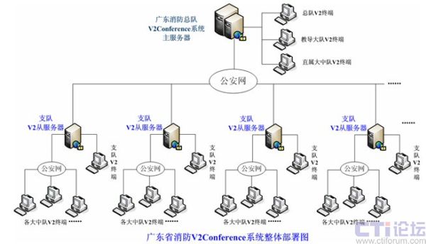 根據(jù)整目前廣東省消防部隊(duì)網(wǎng)絡(luò)整體部署在全省公安網(wǎng)絡(luò)基礎(chǔ)之上,已經(jīng)全部接入公安網(wǎng)絡(luò),所以V2 Conference系統(tǒng)也構(gòu)建在這個網(wǎng)絡(luò)平臺之上,如下所示: