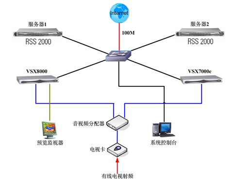 應(yīng)急備份:此系統(tǒng)中服務(wù)器1和服務(wù)器2互為備份;VSX8000和VSX7000e互為備份。RSS2000分配公網(wǎng)IP以便用戶通過互聯(lián)網(wǎng)接收直播和點播,兩臺服務(wù)器的地址同時發(fā)布在網(wǎng)站上。