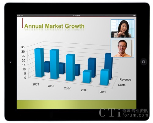 現(xiàn)在,在視頻通信需求增長、勞動力越來越偏遠(yuǎn)以及技術(shù)進(jìn)步的推動下,移動視頻會議正在顯著增長。今天的企業(yè)往往在地域上越來越分散,越來越虛擬,全球遠(yuǎn)程辦公人員已超過10億。同時,技術(shù)的進(jìn)步也推動了視頻移動社會,包括配有攝像頭的移動平板電腦和智能手機(jī)的普及;3G、4G和Wi-Fi網(wǎng)絡(luò)的出現(xiàn);以及云服務(wù)。事實(shí)上,Gartner仍然看好多媒體平板電腦市場帶來的機(jī)會,據(jù)他們預(yù)測到2015年平板電腦將售出3.2億部,到年底,累計銷售將超過9億部。到2015年,采用視頻聊天的人數(shù)預(yù)計將增長14倍,超過1.4億人。