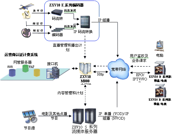 ZXV10系統主要由中間件、流服務器、內容處理設備、STB及網絡平臺組成。