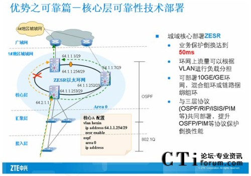 核心交換機(jī)主要是匯聚下行的全千兆智能路由交換機(jī),所以要求設(shè)備提供高密度板卡和線速轉(zhuǎn)發(fā)的能力。同時(shí)保證對(duì)下行端口進(jìn)行帶寬控制,中興采用萬(wàn)兆路由交換機(jī)ZXR10 8905來(lái)滿(mǎn)足用戶(hù)的需求。ZXR10 8900系列萬(wàn)兆路由交換機(jī)是中興通訊推出的新一代的大容量核心/匯聚路由交換機(jī)系列產(chǎn)品,主要定位于運(yùn)營(yíng)商IP城域網(wǎng)、校園網(wǎng)、電子政務(wù)網(wǎng)和大型企事業(yè)網(wǎng)等網(wǎng)絡(luò)的核心/匯聚層。ZXR10 8900系列萬(wàn)兆路由交換機(jī)基于先進(jìn)的模塊化理念進(jìn)行設(shè)計(jì),并采用了基于多處理器并行處理機(jī)制和Crossbar空分交換結(jié)構(gòu)的體系結(jié)構(gòu),關(guān)鍵模塊均采用可以1:1進(jìn)行冗余備份。ZXR10 8900系列具備10GE、GE、FE等各種豐富的接口模塊,并全面支持IPv4、IPv6、組播、QOS、帶寬控制等業(yè)務(wù)功能。ZXR10 8900系列整個(gè)系統(tǒng)所具備的高可靠性、高擴(kuò)展性、良好的業(yè)務(wù)能力等特點(diǎn),可以滿(mǎn)足各種網(wǎng)絡(luò)核心/匯聚層的建設(shè)需求。