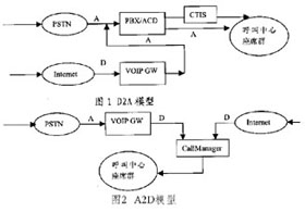 A2D法(Analog to Data) A2D法即事先將呼入呼叫中心的DTMF電話通過VoIP網(wǎng)關(guān)轉(zhuǎn)化為IP電話,再和來自Internet的IP電話一同接入座席代表。A2D法實(shí)現(xiàn)相對比較麻煩,但其將絕大部分工作放到計(jì)算機(jī)網(wǎng)絡(luò)這個(gè)開放的軟件平臺來做,除了有利于更新和開發(fā)外,還能降低成本。同時(shí),這種結(jié)構(gòu)能在地理上和物理上伸縮自如,不僅便于高度集成,而且便于跨地區(qū)構(gòu)建。