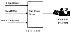 目前,IP Call Center實(shí)現(xiàn)綜合媒體統(tǒng)一處理的方式已取得比較一致觀點(diǎn),即如圖3的語音媒體流和IP傳真、Web主頁、Email進(jìn)入座席群前先經(jīng)過一個(gè)服務(wù)軟件進(jìn)行統(tǒng)一處理,該服務(wù)軟件一般廠家都稱為Call Center Server(簡稱CCS服務(wù)器),它起著完成呼叫控制、路由處理、與呼叫同步的用戶數(shù)據(jù)管理及信息監(jiān)視等作用。