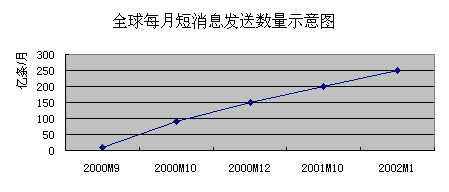 。。2001年全球的短消息服務(wù)業(yè)得到了迅猛的發(fā)展,全球共發(fā)送短消息2000億條。在中國短消息服務(wù)市場中,中國移動(dòng)在2001年發(fā)送短消息159億條,中國聯(lián)通發(fā)送短消息30億條。隨著中國移動(dòng)和中國聯(lián)通之間的互聯(lián)互通,中國短消息市場在2002年將達(dá)到300億條。并且中國電信和中國網(wǎng)通也加入到此市場中,中國固話短消息也將在此市場中占有一席之地。 中國的移動(dòng)用戶在2002年4月已經(jīng)到了1.6億戶,并且還在以500萬戶/月的速度發(fā)展,估計(jì)到2005年中國的移動(dòng)用戶將達(dá)到4.5億戶,中國手機(jī)用戶在35歲以下的占80%左右,他們是使用短消息的主體人群,因此中國移動(dòng)短消息具有非常大的發(fā)展?jié)摿Α?/p>
