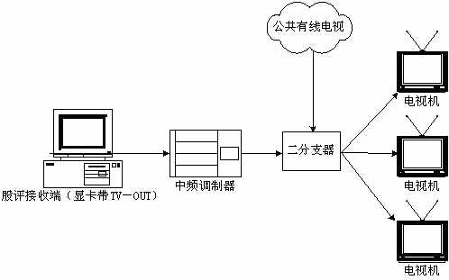 本系統(tǒng)接收端接收實時廣播時,除了用普通PC機收看,或把PC機接收到的信號輸?shù)诫娨暎ù笃粒┥鲜湛,甚至還可以接入有線電視網(wǎng)進(jìn)行播放。具體方法是通過一個接收端接收股評節(jié)目,通過帶TV-OUT的顯卡把TV信號輸出到中頻調(diào)制設(shè)備,中頻調(diào)制設(shè)備可以把基帶模擬信號轉(zhuǎn)換成一個有線電視信號,且傳輸距離遠(yuǎn),損失小,再把這個信號與有線電視信號一起接入一個二分支器(2進(jìn)1出),這就可以和公共有線電視共存,形成自己的頻道,供電視接收。