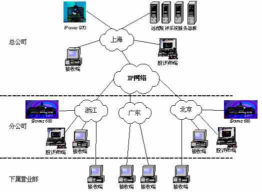某證券公司有三級網(wǎng)絡(luò),總公司、分公司和下屬營業(yè)部。總公司到分公司帶寬是2M,在總公司配置一套會議室型電視會議終端POLYCOM 970和一套多點會議服務(wù)器Radvision ViaIP400。在分公司配置了38套會議室型電視會議終端POLYCOM 680,用于與總公司進(jìn)行雙向視頻會議。分公司到營業(yè)部帶寬是512K,各營業(yè)部安裝遠(yuǎn)程股評系統(tǒng)接收端程序,遠(yuǎn)程股評系統(tǒng)服務(wù)器都放置在海通總公司。當(dāng)在總公司進(jìn)行股評時,總公司本地攝像頭拍攝教師畫面,MIC采集教師聲音,傳給服務(wù)器編碼,再通過網(wǎng)絡(luò)供各個接收端接收;當(dāng)在分公司進(jìn)行股評時,首先分公司的電視會議設(shè)備采集教師畫面及聲音傳回總公司的電視會議設(shè)備,再傳給遠(yuǎn)程股評系統(tǒng)的服務(wù)器進(jìn)行編碼,然后通過網(wǎng)絡(luò)發(fā)布,供接收端接收。(結(jié)構(gòu)如下圖)