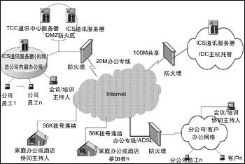 在實(shí)際建立的系統(tǒng)中,采用了公司內(nèi)部3臺(tái)服務(wù)器。一臺(tái)ICC主要用作登錄認(rèn)證及用戶(hù)和服務(wù)器管理;2臺(tái)ICS服務(wù)器,一臺(tái)布置在防火區(qū),供外網(wǎng)用戶(hù)的訪問(wèn),一臺(tái)在內(nèi)網(wǎng),供公司內(nèi)部員工使用。在公司外面,托管了一臺(tái)ICS(通訊服務(wù)器),供公司外部用戶(hù)訪問(wèn)。