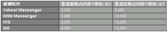 在使用Windows平臺(tái)下的PC也只有內(nèi)存還稍顯珍貴,所以就這四款軟件所占用的內(nèi)存進(jìn)行了對(duì)比。結(jié)果如下:Yahoo! Messenger所占的內(nèi)存,無(wú)論在登錄前后都是最小的;第二名,MSN Messenger在功能龐大的情況下,能做得如此精巧實(shí)屬難得;第三名,ICQ從2000版開(kāi)始對(duì)內(nèi)存的占用始終比較穩(wěn)定,只是在出了中文界面后稍高一些;第四名,QQ啟動(dòng)出現(xiàn)登錄界面時(shí)還沒(méi)顯出味口有多大,不想登錄后隨著系統(tǒng)信息和Flash廣告等傳到客戶(hù)端占用內(nèi)存的峰值竟然能達(dá)到15,000K,相信內(nèi)存小一些的機(jī)器在QQ登錄后就要多等一會(huì)兒了。