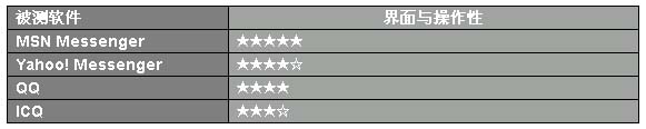 對(duì)于IM類(lèi)軟件來(lái)說(shuō),網(wǎng)友希望其界面在精美的同時(shí)越簡(jiǎn)單越直接越好。在這一點(diǎn)上,MSN Messenger最為突出,界面精致,操作極易上手,在本次評(píng)測(cè)中獲得一致認(rèn)可,位列第一;Yahoo! Messenger操作上也比較直觀,只是“做工”顯得有些粗糙;被測(cè)的QQ2003剛剛在界面上做了重大的改變,只是稍顯零亂,對(duì)MSN的部分借鑒比較成功,對(duì)于一個(gè)新用戶(hù)來(lái)說(shuō)最基本的功能的使用還算方便;ICQ功能的確強(qiáng)大,界面有些老舊,(ICQ Lite可以改變這一切,但是ICQ Lite僅僅是ICQ的一個(gè)插件版本,本次評(píng)測(cè)沒(méi)有考慮),ICQ操作對(duì)中文用戶(hù)來(lái)說(shuō)也過(guò)于繁復(fù)。