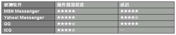 MSN Messenger和Yahoo! Messenger的操作都很簡(jiǎn)單,只是MSN Messenger在同樣的畫(huà)質(zhì)下延遲要小于Yahoo! Messenger,表現(xiàn)出更優(yōu)的實(shí)用性。QQ操作也不算太復(fù)雜,只是會(huì)員和非會(huì)員在功能上有一些限制,不過(guò)在同畫(huà)質(zhì)的延遲方面做的算是出色,ICQ操作沒(méi)有測(cè)試成功。