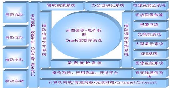 支撐平臺有計算機網(wǎng)絡(luò)系統(tǒng)、監(jiān)控系統(tǒng)、顯示系統(tǒng)、GPS系統(tǒng)、有/無線通信系統(tǒng)、圖像傳輸系統(tǒng)、電源及機房、軟件支撐平臺等。其中,計算機網(wǎng)絡(luò)系統(tǒng)包括指揮中心、二級指揮中心與移動指揮中心、業(yè)務(wù)執(zhí)行機構(gòu)(如:應(yīng)急中隊、派出所等)之間的三級計算機網(wǎng)絡(luò),即指揮中心局域網(wǎng)絡(luò)、業(yè)務(wù)機關(guān)網(wǎng)絡(luò)、與分支機關(guān)的廣域網(wǎng)絡(luò)、與移動指揮中心的遠(yuǎn)程訪問網(wǎng)絡(luò)。指揮中心與二級指揮中心、分支機構(gòu)、移動中心之間有語音通信、數(shù)據(jù)通信,指揮中心與移動中心有語音通信、數(shù)據(jù)通信(無線)、現(xiàn)場圖像傳輸;指揮中心與公安其它機構(gòu)通過撥號網(wǎng)絡(luò)訪問(內(nèi)網(wǎng)),指揮中心與普通老百姓通過撥號網(wǎng)絡(luò)訪問(外網(wǎng))。