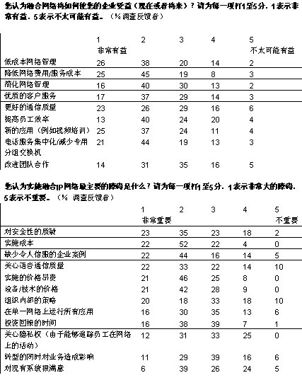 我們調(diào)查的企業(yè)中,有超過三分之二將在未來五年內(nèi)實現(xiàn)大多數(shù)或者所有部門向融合網(wǎng)絡(luò)的轉(zhuǎn)型。大部分企業(yè)采取按部就班的形式在某些特殊部門和業(yè)務(wù)開始部署。在融合應(yīng)用中,IP語音電話將在未來三年內(nèi)吸引大量投資;管理人士期望通過大幅削減公司內(nèi)部的通話費用獲得早期的回報。在更廣泛的層面上,大多數(shù)管理者預(yù)計,融合網(wǎng)絡(luò)對其企業(yè)的商業(yè)影響將會“非常重要”或者“重要”。
