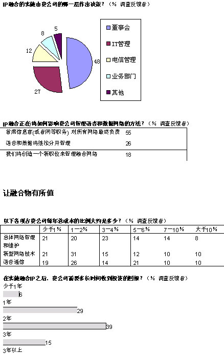 融合網(wǎng)絡(luò)已經(jīng)成為現(xiàn)實。在經(jīng)濟學(xué)家信息部展開的全球調(diào)查中,103位高級經(jīng)理中超過半數(shù)的人投票表示,他們的企業(yè)已經(jīng)開始實施IP網(wǎng)絡(luò)融合,還有26%表示他們將計劃部署。
