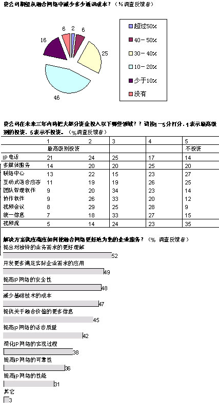 盡管如此,雖然IP融合的真正長期效益可能有利于提高員工效率,但是投資必須得到公司首席財務(wù)官的認可。在總體網(wǎng)絡(luò)成本中預(yù)計可以節(jié)約多少?大多數(shù)公司希望削減10%-20%的費用,也有相當(dāng)一部分公司期望減少30%-40%的費用。上述報告中提到的實例中表明,這樣的節(jié)約是可以實現(xiàn)的。