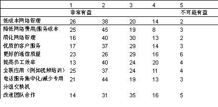您認為融合網(wǎng)絡(luò)將怎樣使您的企業(yè)受益(現(xiàn)在或者將來)?請為每一項打1至5分,1表示非常有益,5表示不可能有益。(% 調(diào)查反饋者)