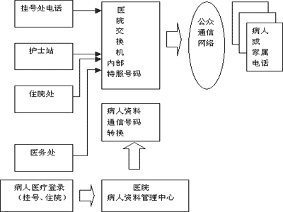 病人資料數(shù)據(jù)庫保存的病人資料均與病人住院、就診代號(hào)對(duì)應(yīng),醫(yī)護(hù)人員因工作需要欲與病人或家屬聯(lián)系時(shí),使用本部門的電話通過呼叫中心獲得使用權(quán)限。交換機(jī)給醫(yī)院內(nèi)部指定一個(gè)"特服號(hào)碼",負(fù)責(zé)與病人通信。