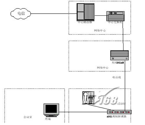 通過(guò)V.35接口接入到用戶網(wǎng)絡(luò)中的路由器上,電信網(wǎng)絡(luò)中心的MODEM則通過(guò)V.35接口接入到電信網(wǎng)絡(luò)的路由器上,連接速率從64Kbps-2Mbps可選,可以滿足視頻會(huì)議的接入要求。