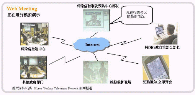 在韓國已經(jīng)安排多次的模擬演示,當(dāng)疫情在韓國發(fā)生及蔓延時(shí),由韓國傳染病控制及預(yù)防中心發(fā)出開會(huì)通知,召集其他緊急醫(yī)療機(jī)構(gòu)、專家及政府部門(如行政自治部)等,一起進(jìn)行視像會(huì)議。在會(huì)議上,傳染病控制中心將各地收集回來的最新情況及報(bào)表共享給參會(huì)人及團(tuán)體。由各專家一起分析現(xiàn)況,進(jìn)行討論、判斷及決定解決辦法及措施。同時(shí)要求其他政府部門協(xié)調(diào)與全力幫助,目的是將疫情在最短的時(shí)間及在最少的范圍內(nèi)得到控制及處理,減少對(duì)人民生命安全及國家損失的影響。先進(jìn)的通訊科技能加快對(duì)危機(jī)發(fā)生時(shí),政府相關(guān)部門及機(jī)構(gòu)對(duì)事件的了解、分析、處理及決策,準(zhǔn)確傳達(dá)信息、加強(qiáng)信息的交流、提高辦事效率、加快決策速度以及落實(shí)措施及處理方法的執(zhí)行。最重要的事,將各方面的損失降到最低的程度,避免了事情的惡化及波及其他范圍的負(fù)面影響。