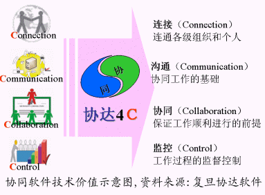 V4.0 ,協(xié)同軟件圍繞著構(gòu)建網(wǎng)上虛擬工作場所,在IT應(yīng)用上所體現(xiàn)的價值,主要是4C,即:"連接Connection、溝通Communication、協(xié)作Collaboration、監(jiān)控Control",這也是協(xié)同軟件的主要IT技術(shù)價值的體現(xiàn)。
