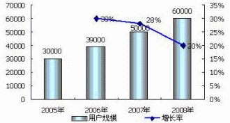 2005-2008年中國(guó)移動(dòng)增值業(yè)務(wù)用戶(hù)規(guī)模發(fā)展及預(yù)測(cè) (萬(wàn))