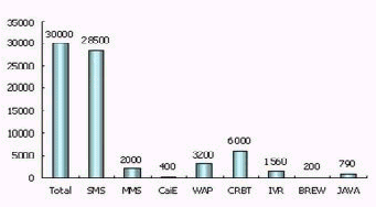2005年,中國(guó)的移動(dòng)增值業(yè)務(wù)用戶(hù)規(guī)?倲(shù)達(dá)到了3億,其中短信用戶(hù)伴隨移動(dòng)通信用戶(hù)的穩(wěn)定增長(zhǎng)而增長(zhǎng),MMS、CaiE、JAVA、BREW等數(shù)據(jù)業(yè)務(wù)隨著終端的普及以及產(chǎn)品的豐富,增長(zhǎng)很快,以上四類(lèi)數(shù)據(jù)增值業(yè)務(wù)累計(jì)用戶(hù)2005年已超過(guò)2500萬(wàn)。