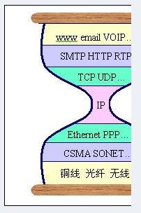 RFC1958和RFC3724等所描述的“端到端的透明性”是Internet一直堅持的為數(shù)不多的Internet體系架構(gòu)的核心設(shè)計理念。所謂端到端的透明性,就是在TCP/IP的設(shè)計中,將Internet系統(tǒng)中與通信相關(guān)的部分(IP網(wǎng)絡(luò))與高層應(yīng)用(端點(diǎn))分離,最大限度地簡化網(wǎng)絡(luò)的設(shè)計。在有些文獻(xiàn)中也稱其為“沙漏”模型,如圖1。